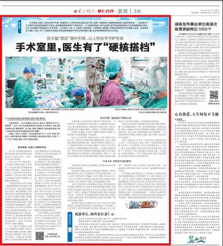 对患者而言,一台手术最核心的诉求,莫过于“做得准、伤口小、康复快”。如今,在长沙多家医院的手术室里,手术机器人正成为医生最得力的“硬核搭档”,在大脑、颈部、骨骼等人体关键区域进行着一场场科技与医术完美融合的生命“精雕”。